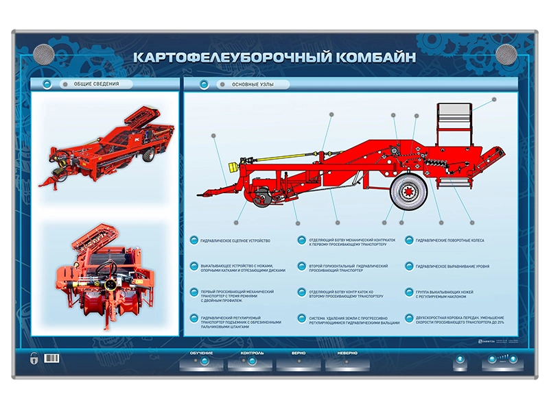 Электрифицированный стенд представляет собой информационную панель с раздельной световой индикацией. На стенде представлено полноцветные изображение, отображающее устройство картофелеуборочного комбайна и его основные конструктивные элементы.