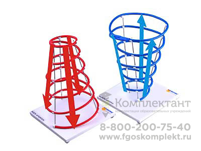 Пособие состоит из моделей циклона и антициклона, имеющих спиралевидную форму и устанавливаемых на подставке. В соответствии с общепринятым обозначением синяя спираль представляет циклон, красная – антициклон. Цветные стрелки, входящие в комплект, обозначают нисходящие и восходящие потоки воздуха.